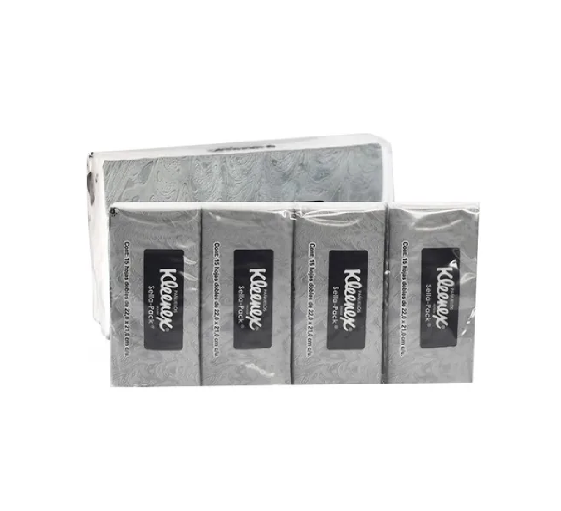 Paquete de 8 unidades de pañuelos Kleenex individuales en presentación Sella Pack. Cada paquete contiene...